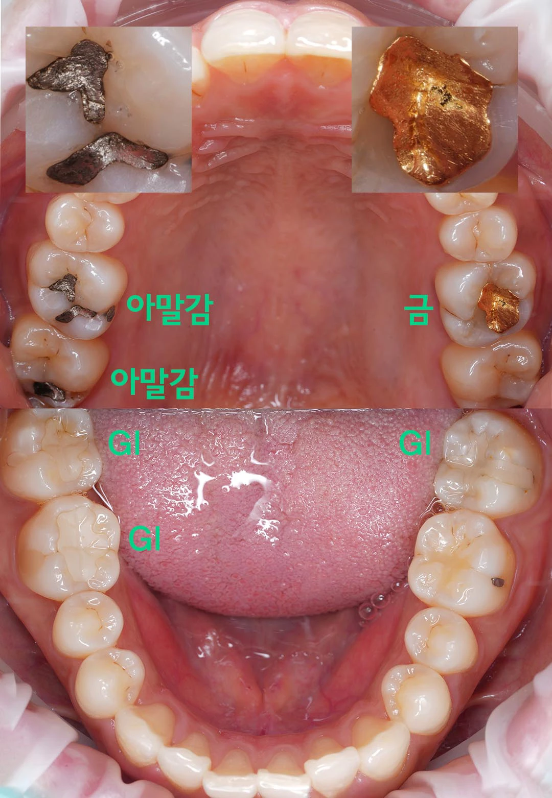 어금니 윗면에 충전 치료 및 인레이 보철 치료한 어금니