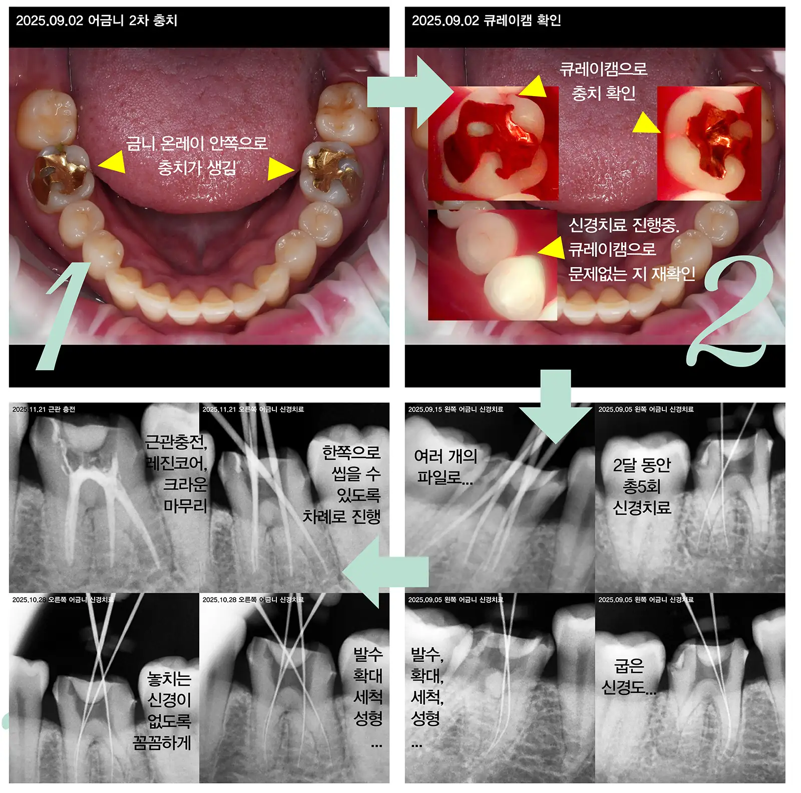 복잡한 신경관은 MTA로 확실히 밀봉하는 것이 재발 방지의 핵심이며, 이후 남아 있는 치아의 양에 따라 레진 코어만 할지, 혹은 뿌리에 기둥을 세우는 포스트 코어까지 할지를 결정하게 됩니다. 이 과정들이 꼼꼼하게 이루어져야만 먼훗날 크라운이 빠지거나 치아 뿌리가 부러지는 불상사를 막을 수 있습니다.