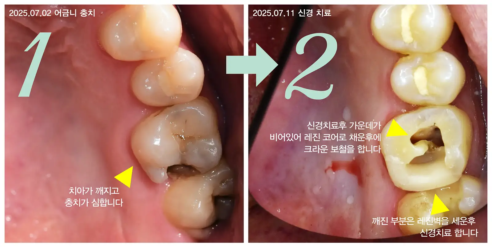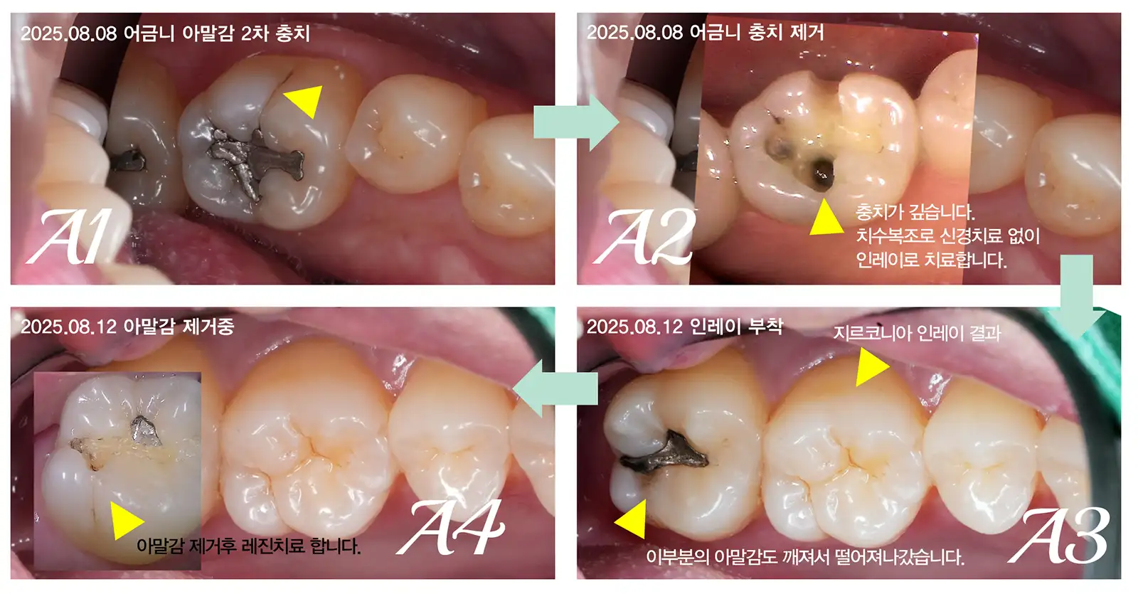 교두가 삭제되었거나 충치 범위가 넓은 경우 치아가 쪼개질 위험이 있어 인레이, 온레이 대신 레진빌드업이나 크라운 보철 치료를 해야합니다.