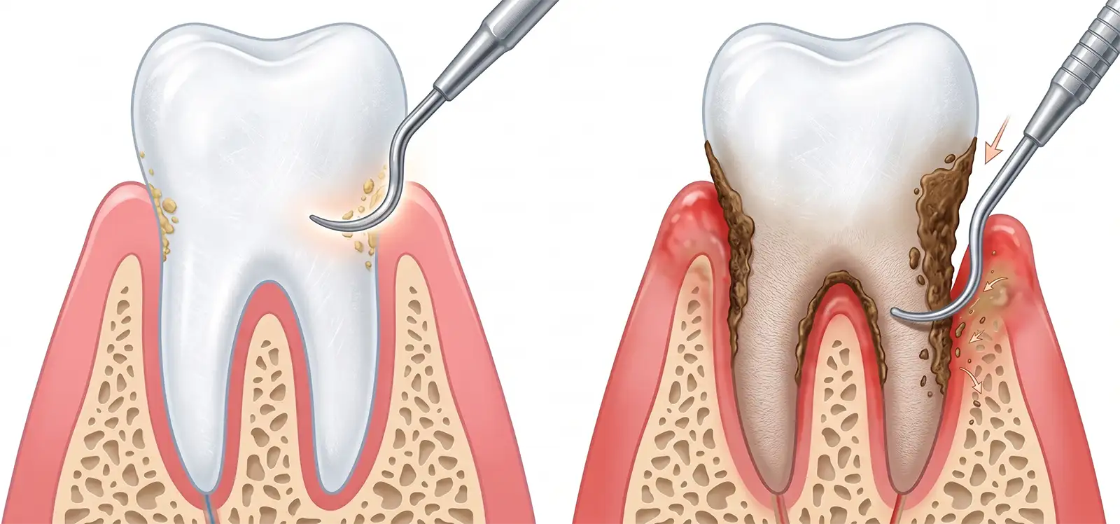 - 잇몸 치료: 잇몸 안쪽, 뿌리 표면에 달라붙은 보이지 않는 치석과 염증 조직까지 제거 (장판 밑의 곰팡이를 긁어내는 심층 복구 공사, 치주 치료)