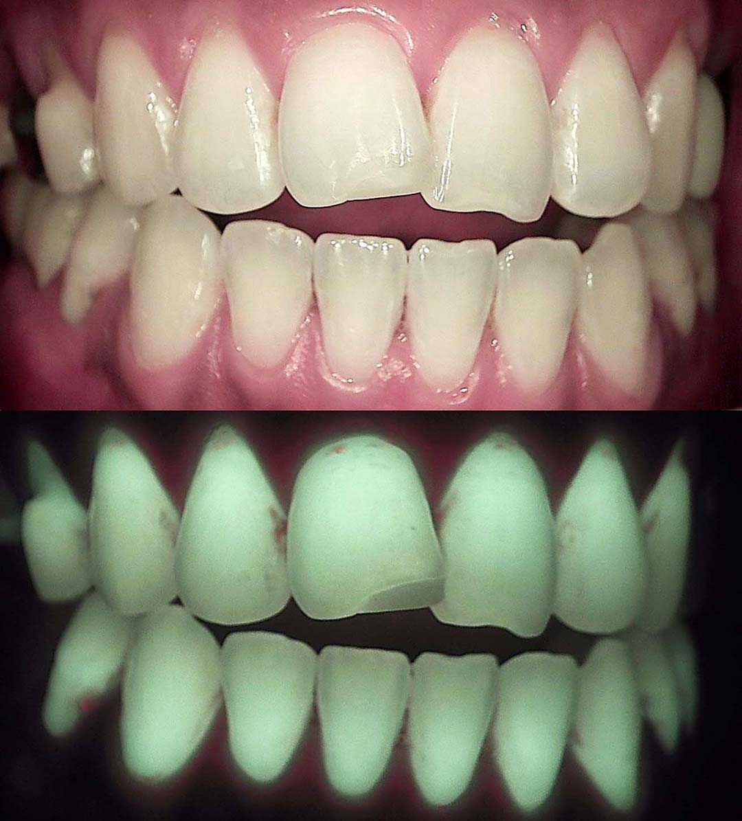 다음은 동일한 치아를 일반 카메라와 큐레이 캠(Q-Ray Cam)으로 찍은 사진입니다.