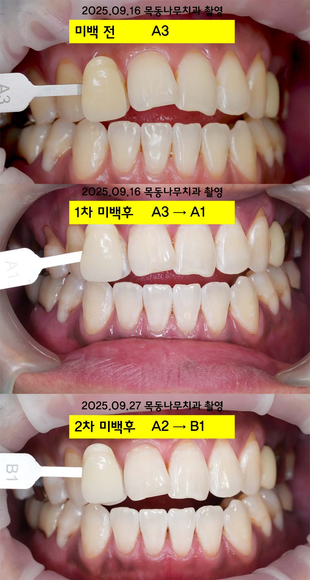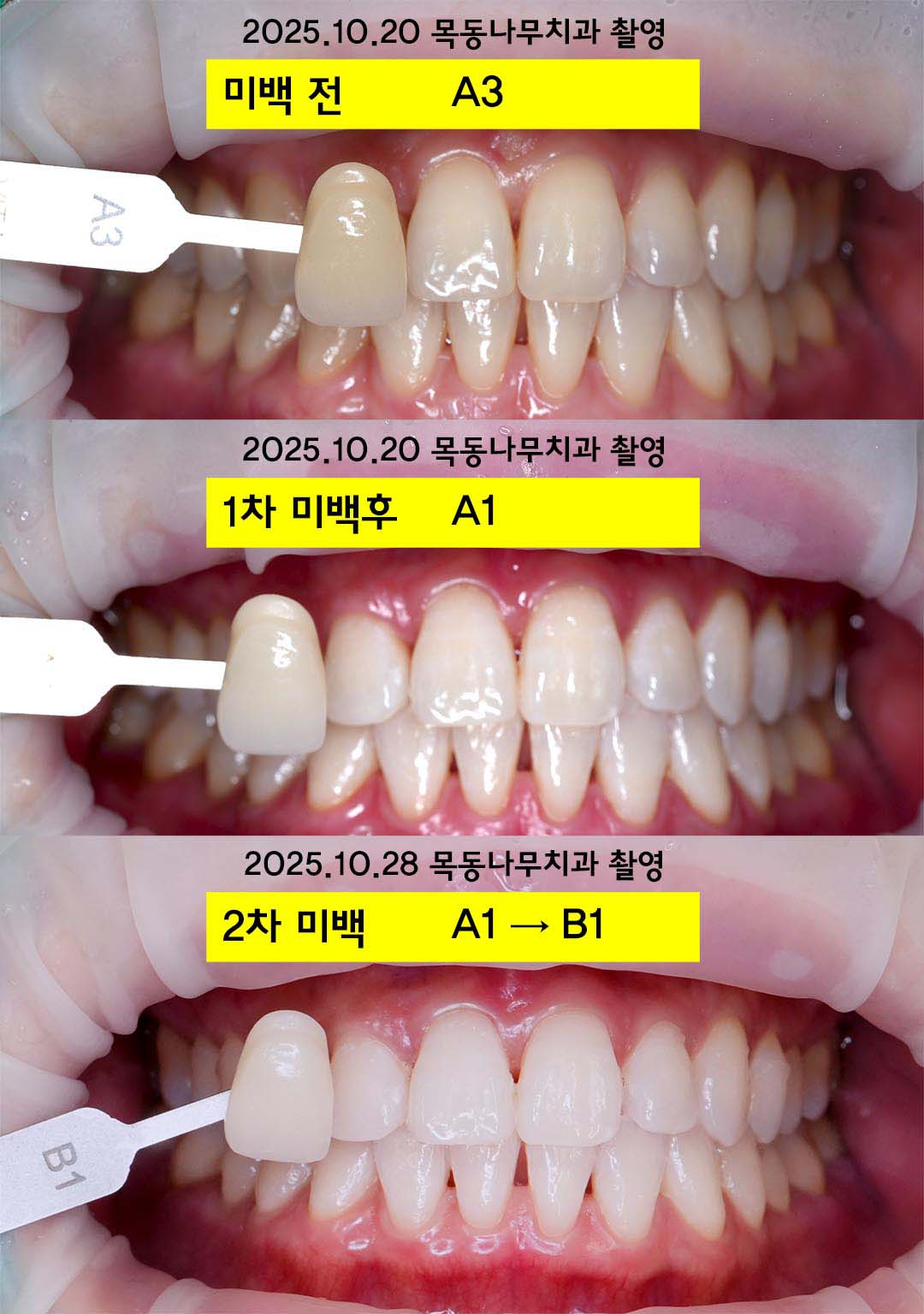 다음은 3회 미백으로 A3에서 A1으로 밝아졌습니다. 2차 미백 후에는 쉐이드 가이드 B1, 3차 미백 후에는 쉐이드 가이드 A1과 함께 사진을 찍었습니다.