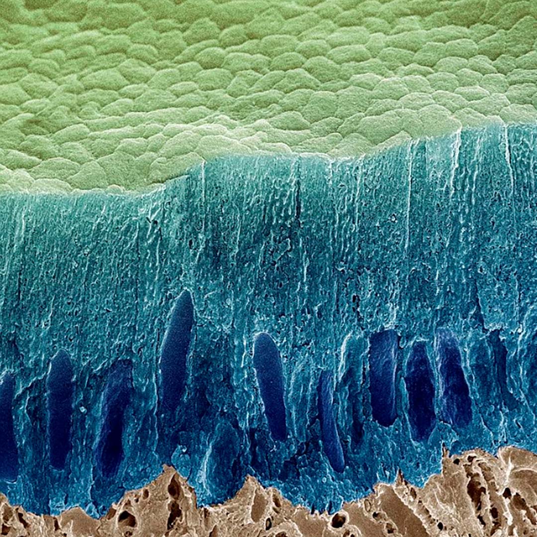육안으로 보기에 치아는 매끄럽고 단단한 도자기처럼 보이지만, 현미경으로 들여다보면 전혀 다른 모습입니다. 치아의 맨 바깥인 법랑질은 수많은 법랑 기둥(Enamel Rods, 법랑 소주)으로 되어 있고, 이 기둥들 사이에는 눈에 보이지 않는 미세한 구멍(미세 공극)들이 무수히 존재합니다. 마치 현무암이나 스펀지처럼 미세한 틈이 있는 구조입니다.